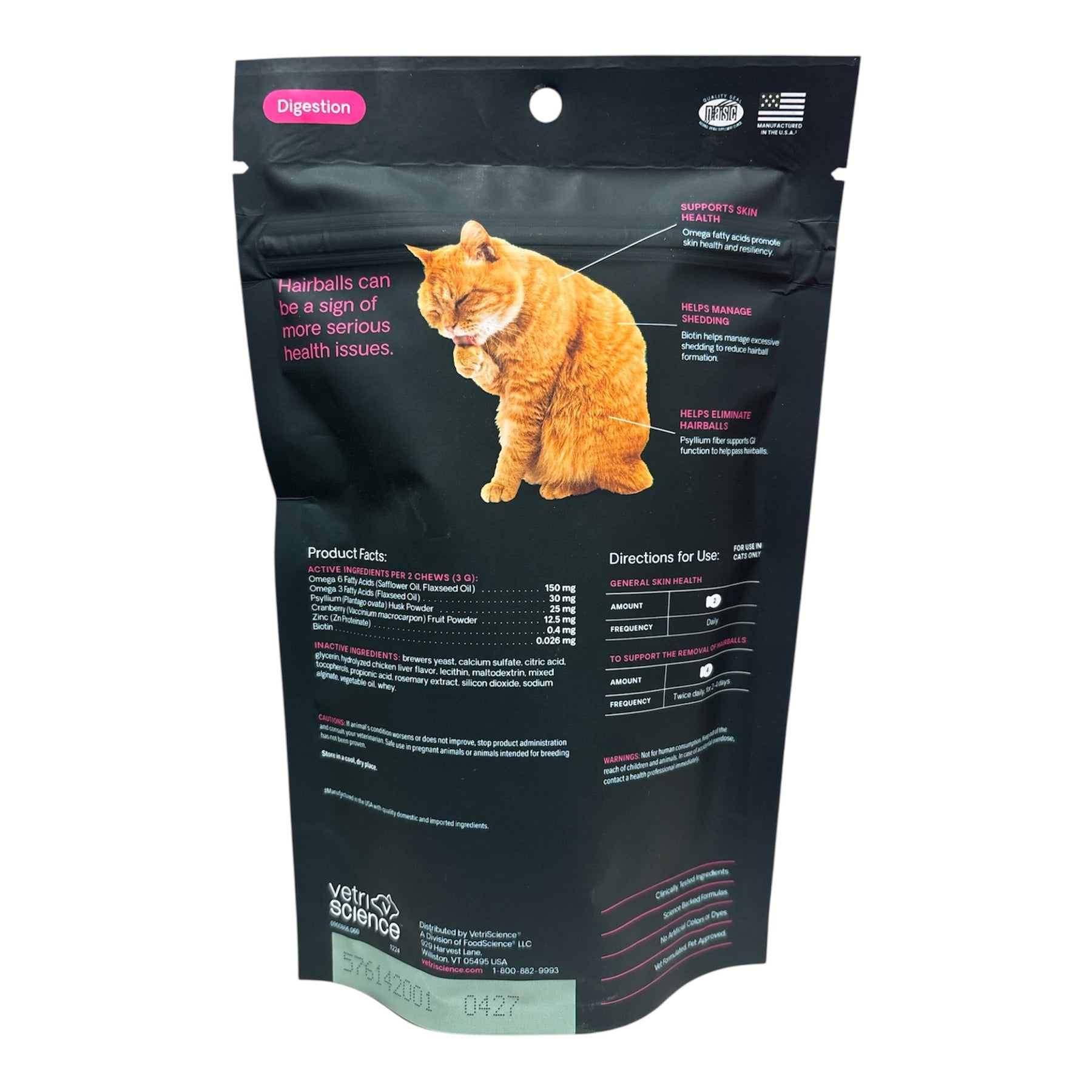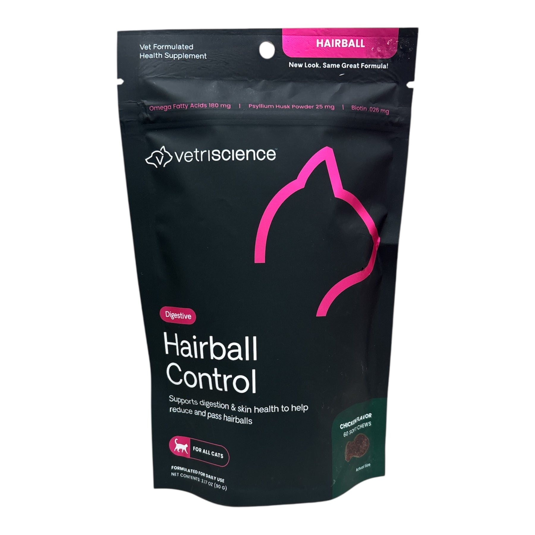 Hairball supplement can help prevent and eliminate hairballs by supporting skin health and normal shedding. Veterinarian formulated without mineral oil or herbals, Hairball features omega 3 and 6 fatty acids to help minimize hairball formation by supporting skin hydration, resiliency and healthy shedding. Biotin is needed for healthy skin and normal shedding. Zinc is involved in keratin and collagen production, which are key factors for skin health. Cranberry powder supports urinary tract health. Hairball is not a laxative or lubricant, which can disrupt feline digestion. Even picky eaters love these delicious chicken liver-flavored chews made with naturally sourced ingredients.